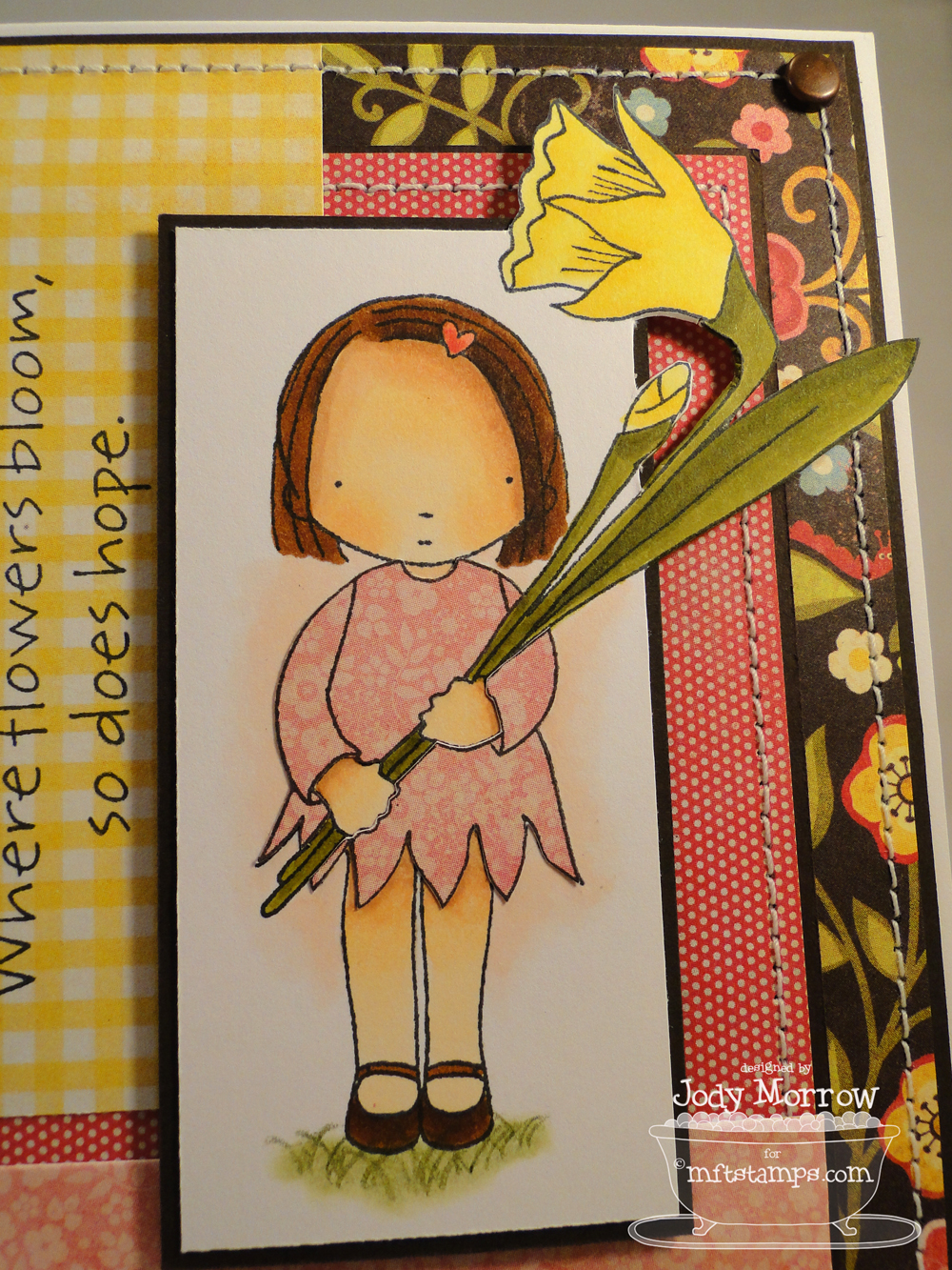 ReplyDeletesooooo adorable! just love her darling litte dress too...and how you've paper pieced the daffodil!