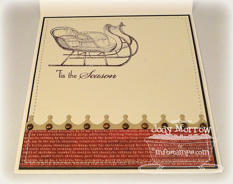 I just can't get enough of stamping this Santa from Inspired by Christmas on kraft card stock and leaving him uncolored. I like the contrast of the cream stitches against the kraft paper. I added some copper brads to the panel as well. And while I am at it, since it's been a while since I have posted a "Jody Rule", let me make this one official: